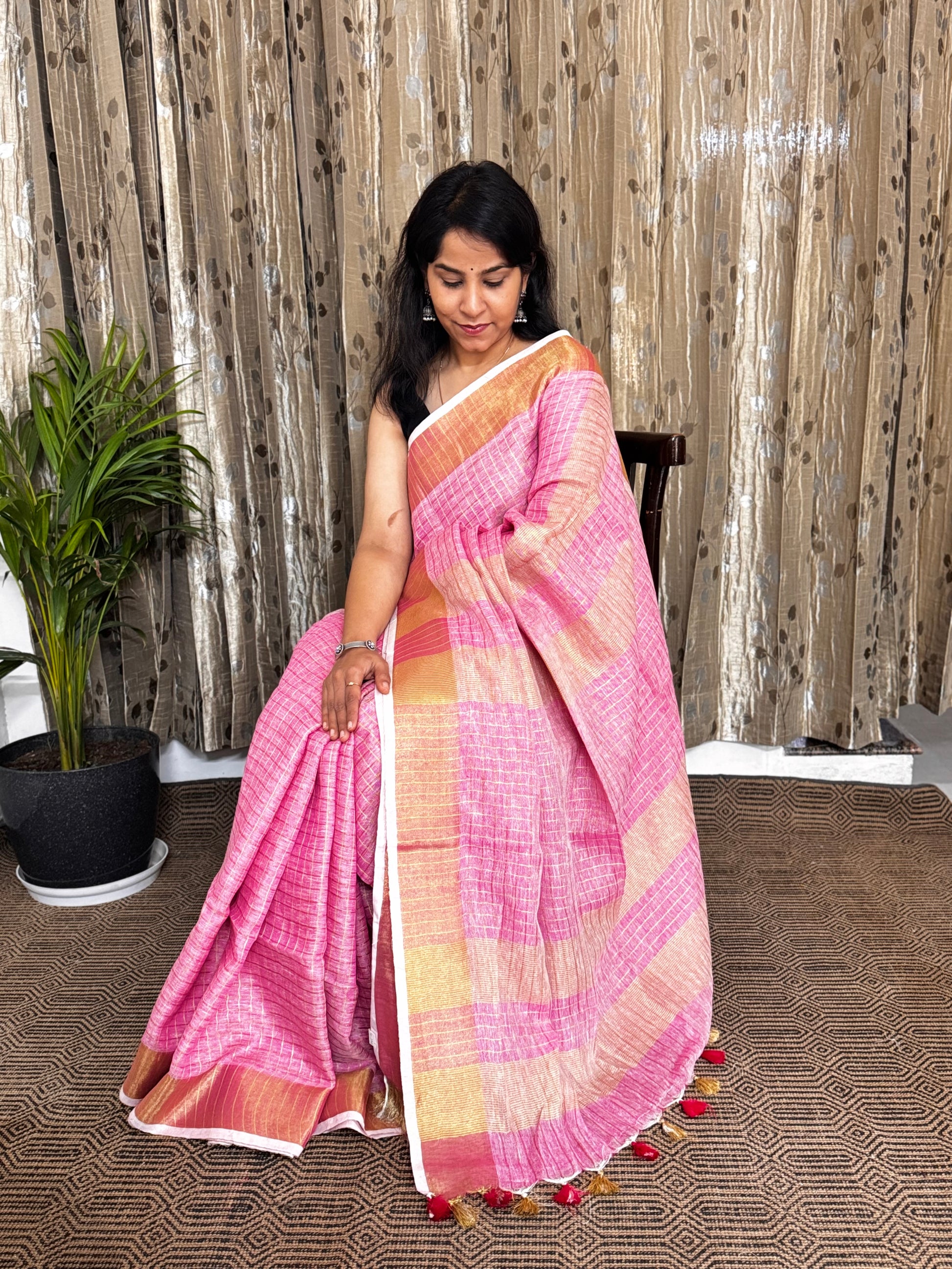 Pink Checked Linen Zari Jamdani Saree