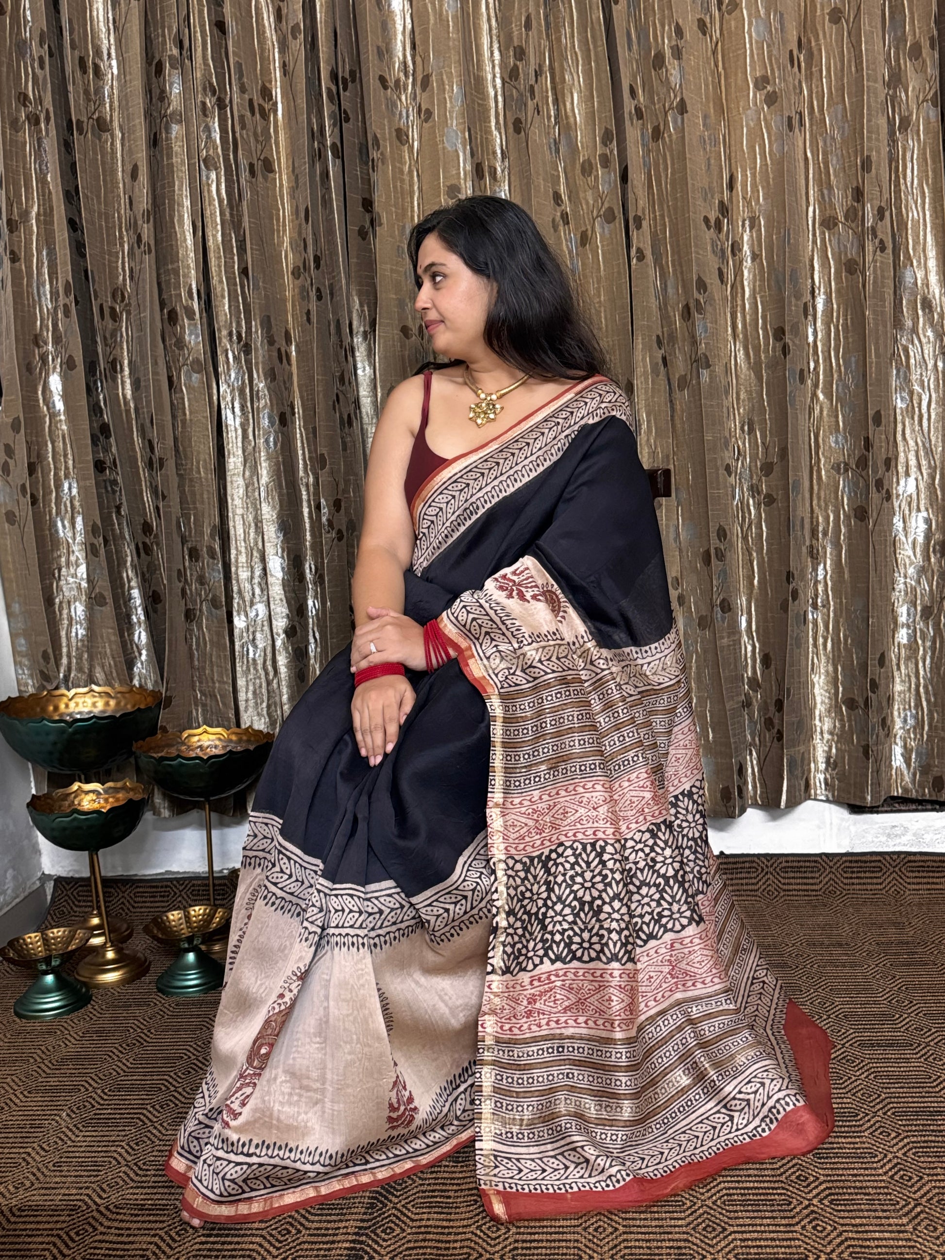 Black Chanderi Silk & Cotton Saree with Zari Woven Border. Comes with its own blouse piece.