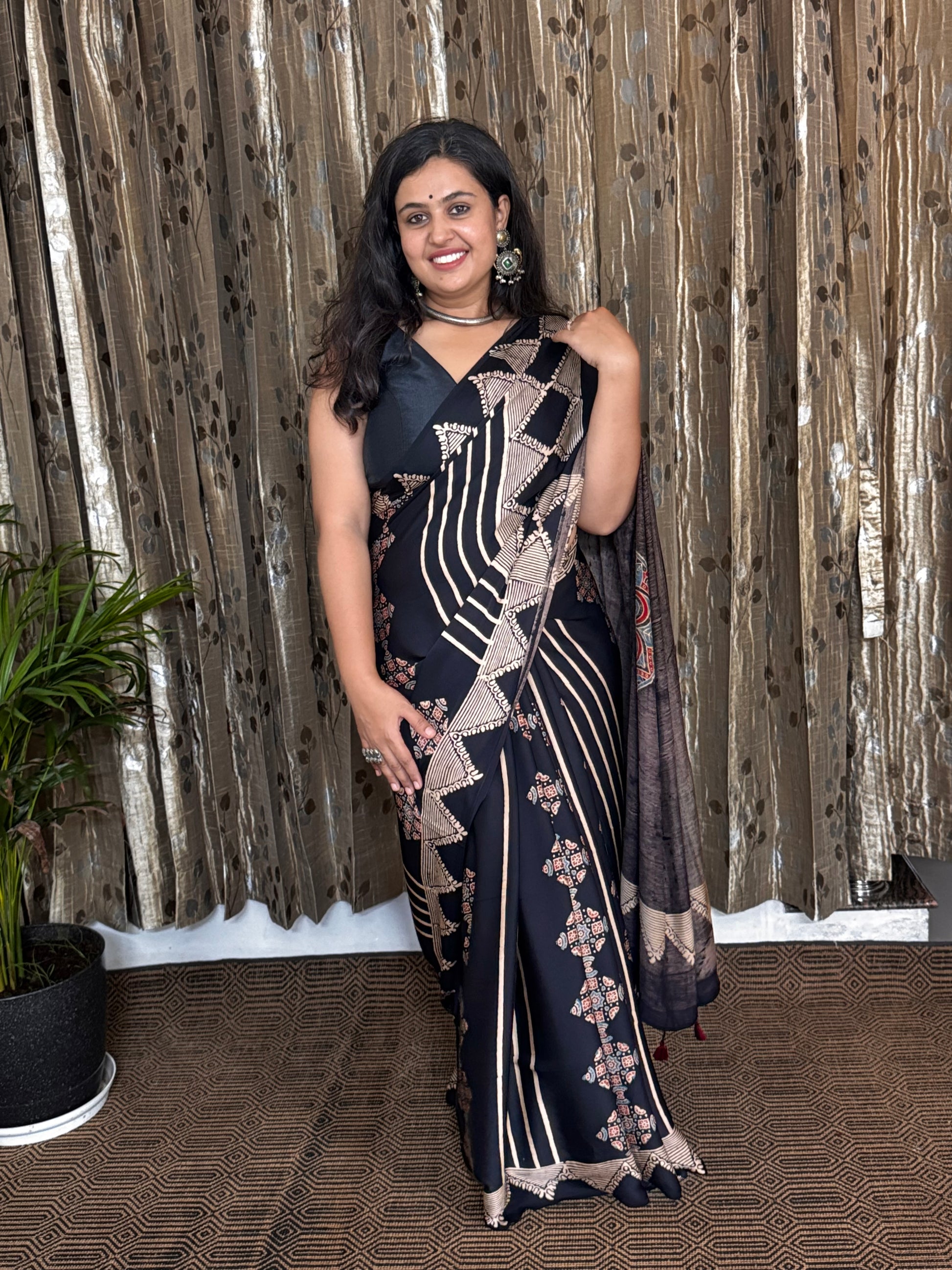 Black and Off White Hand Blockprint Ajrakh Modal Silk Saree - B