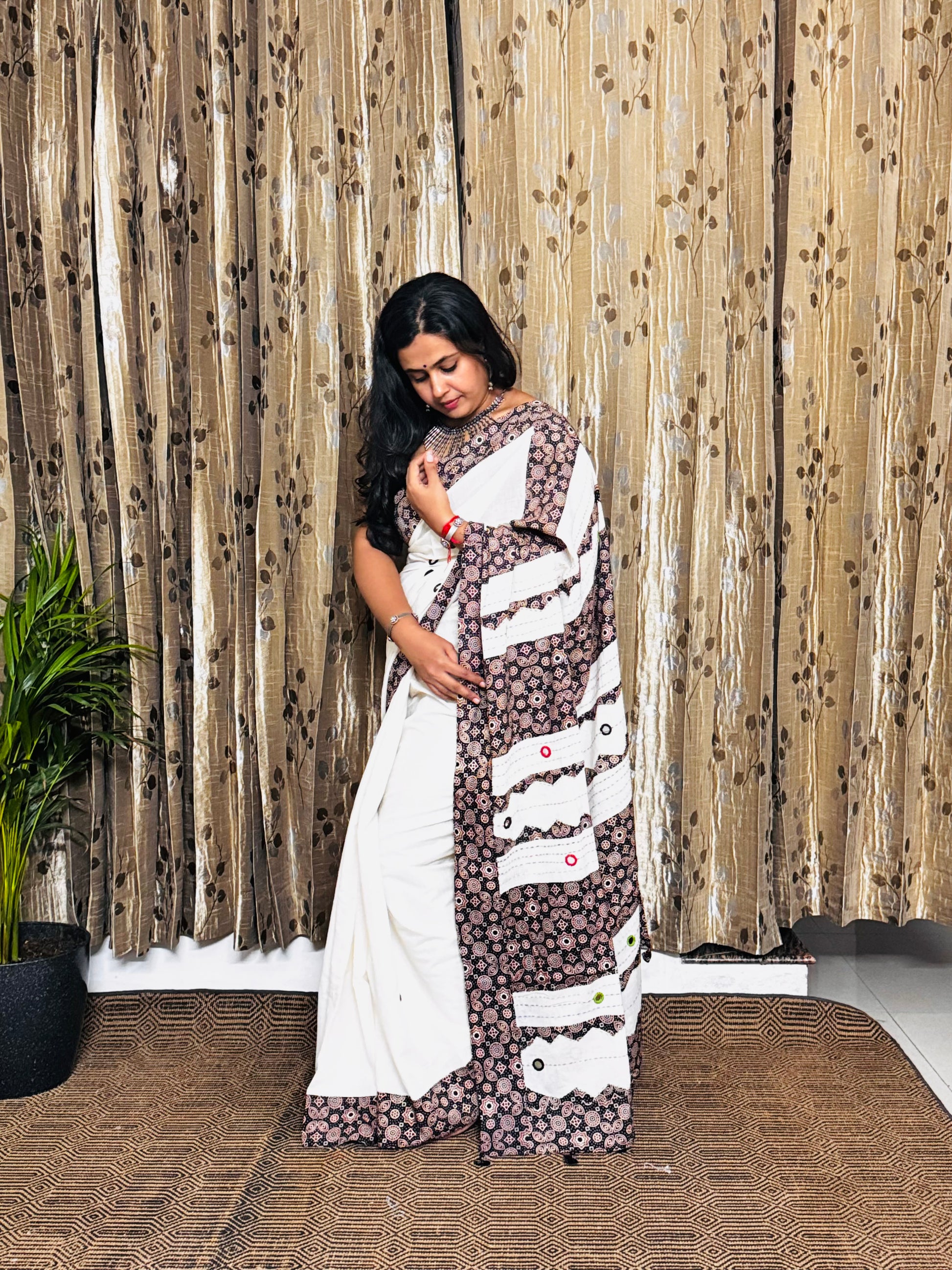 White Applique Patchwork Mul Cotton Tagai Ajrakh Saree