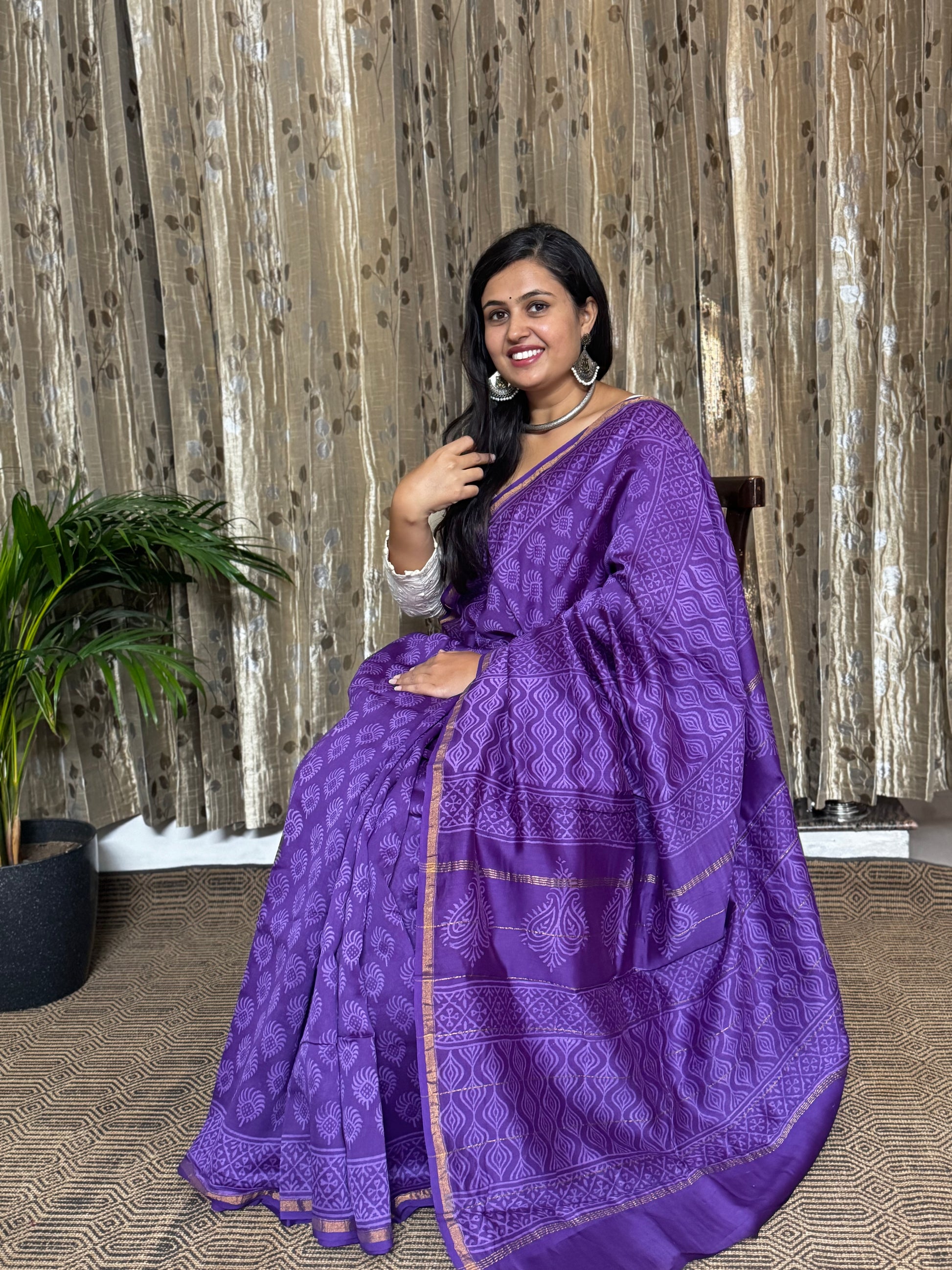 Purple Chanderi Blockprint Silk & Cotton Saree with Zari Woven Border. Comes with its own blouse piece.