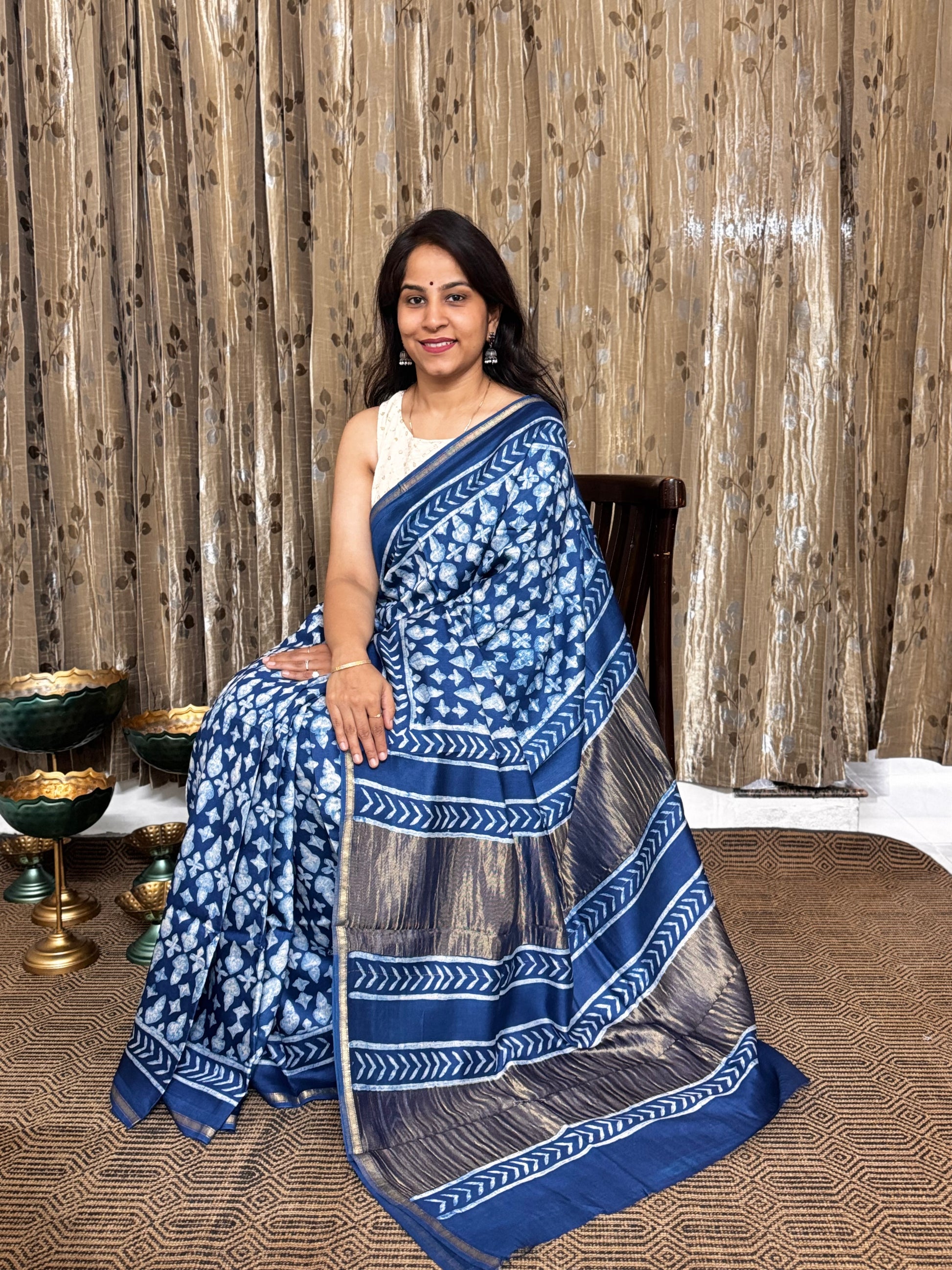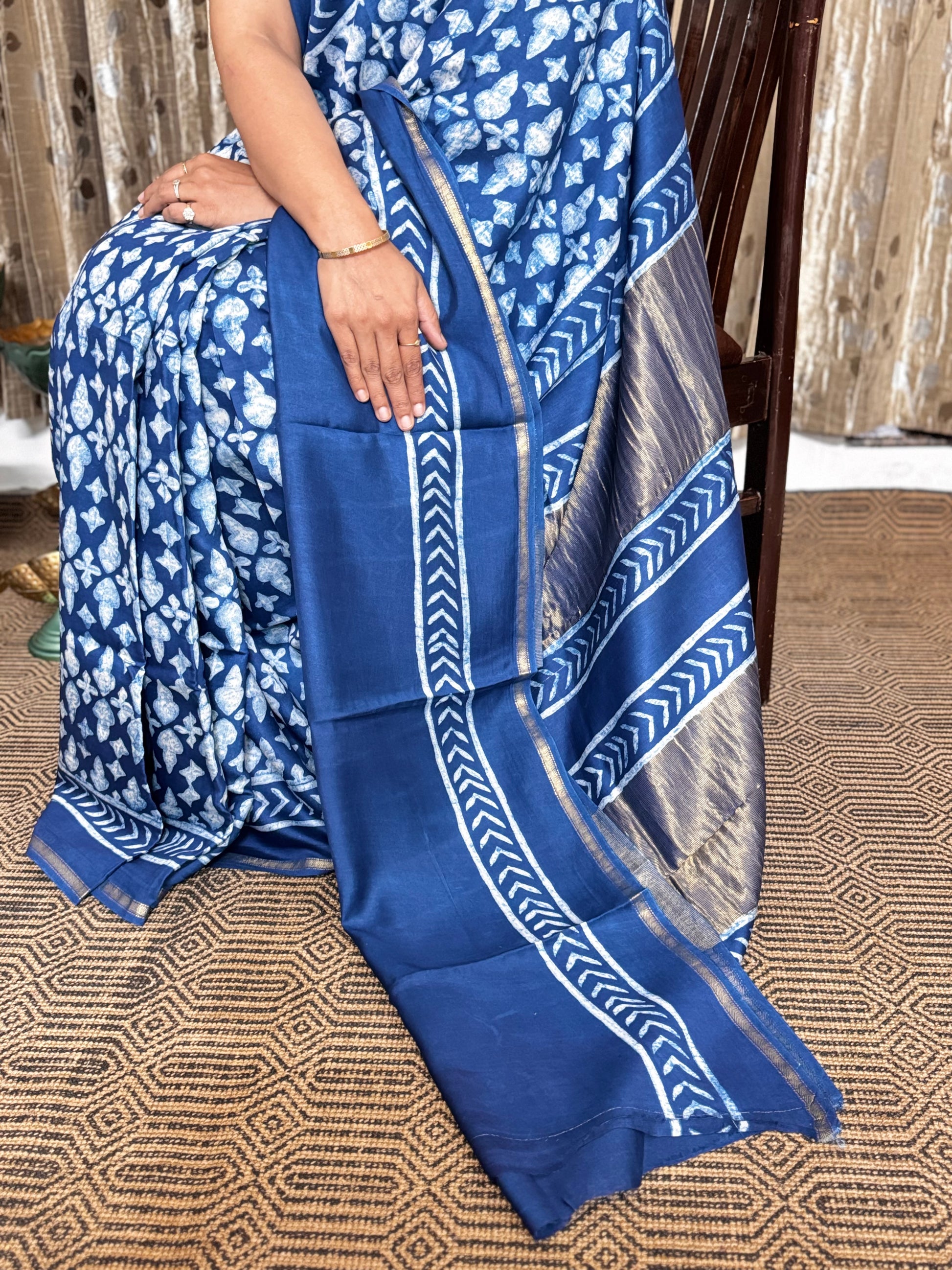 Indigo Maheshwari Blockprint Silk & Cotton Saree with Zari Woven Border and Pallu detailing. Comes with its own blouse piece.