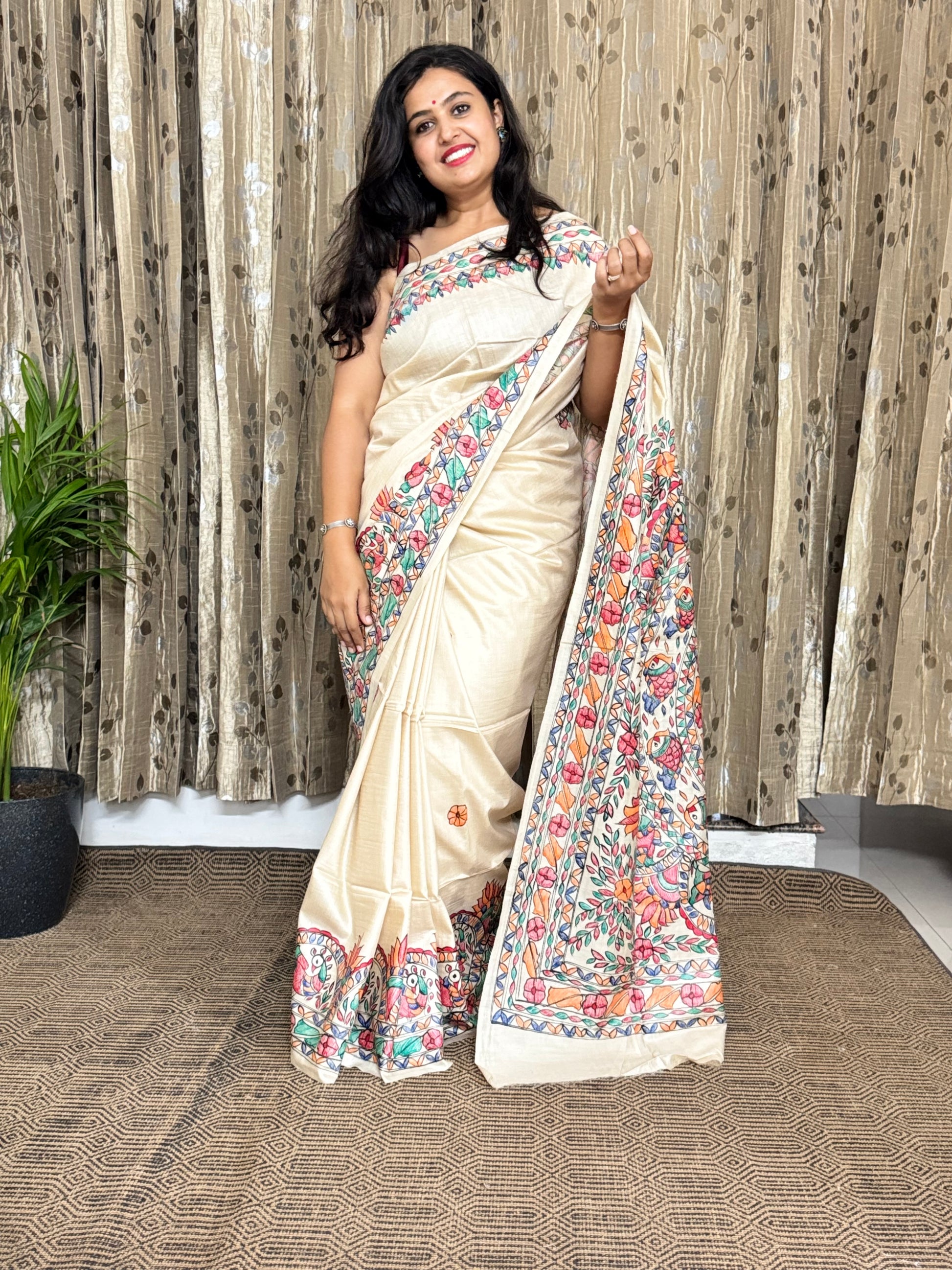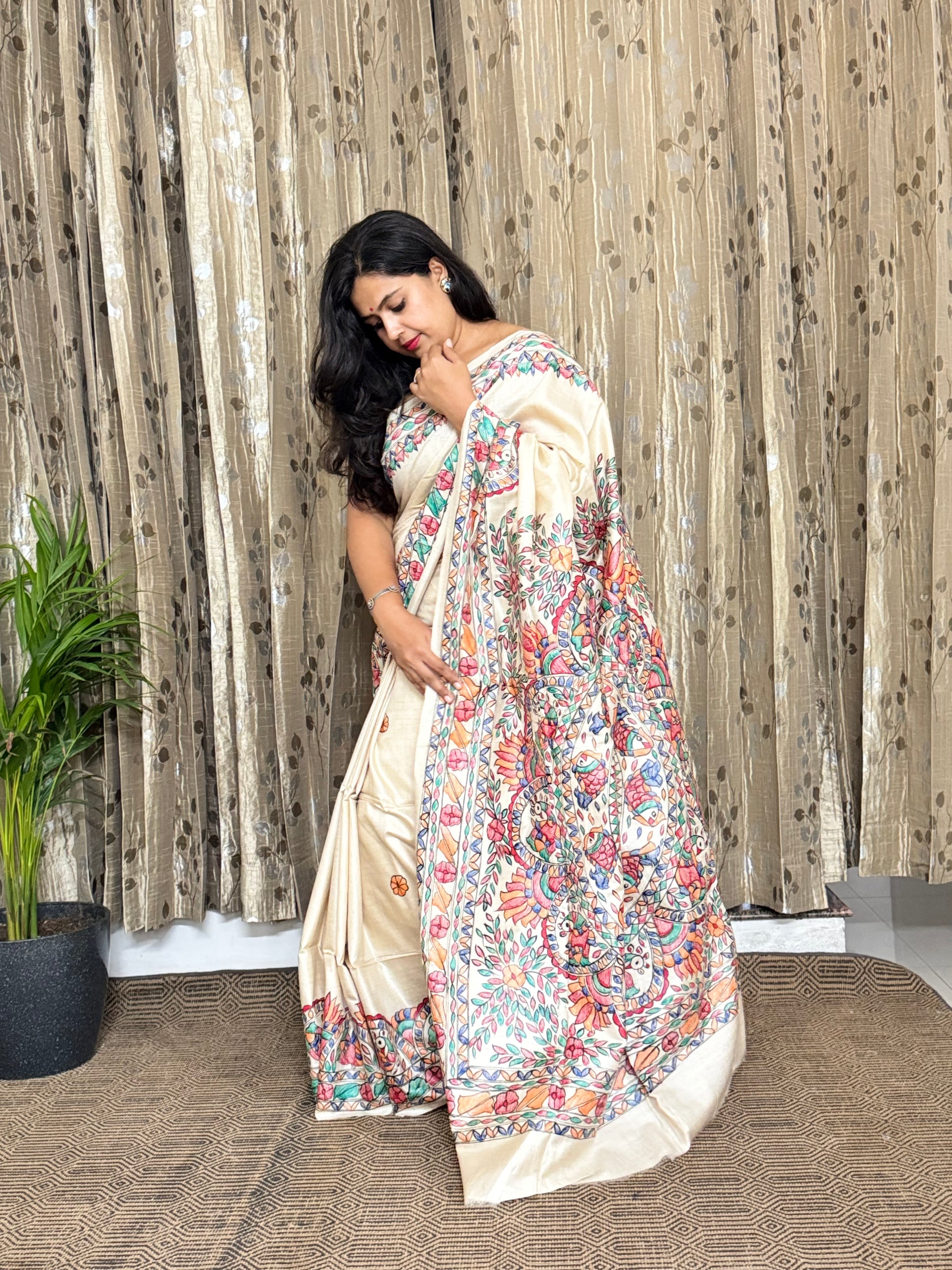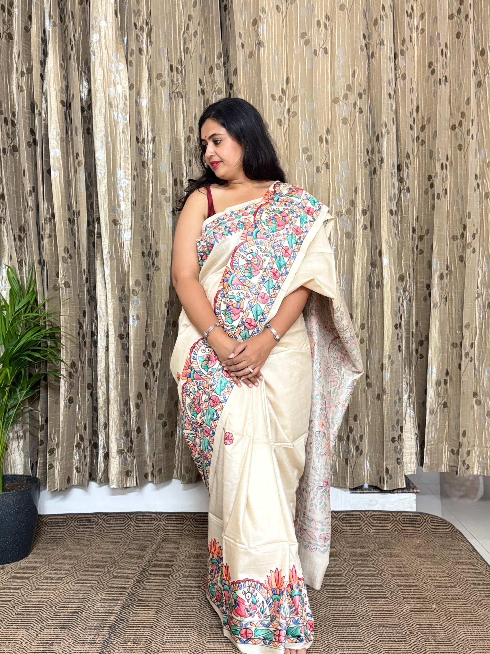 Woven in the natural texture of Tussar Ghicha silk, this saree carries a soft, rustic elegance that feels both timeless and unique. Adorned with handpainted Madhubani art, it reflects the charm of traditional Indian storytelling through intricate patterns and vibrant hues. Each stroke by skilled artisans turns the fabric into a living canvas—where culture, creativity, and craftsmanship come together. This saree is more than just attire; it’s a celebration of heritage, making it a graceful choice for festive occasions or a heartfelt gift for someone special.
