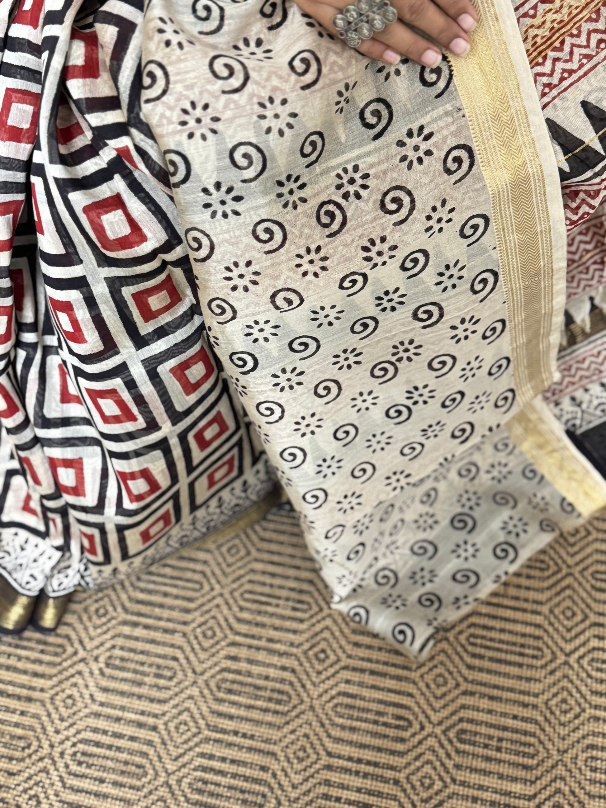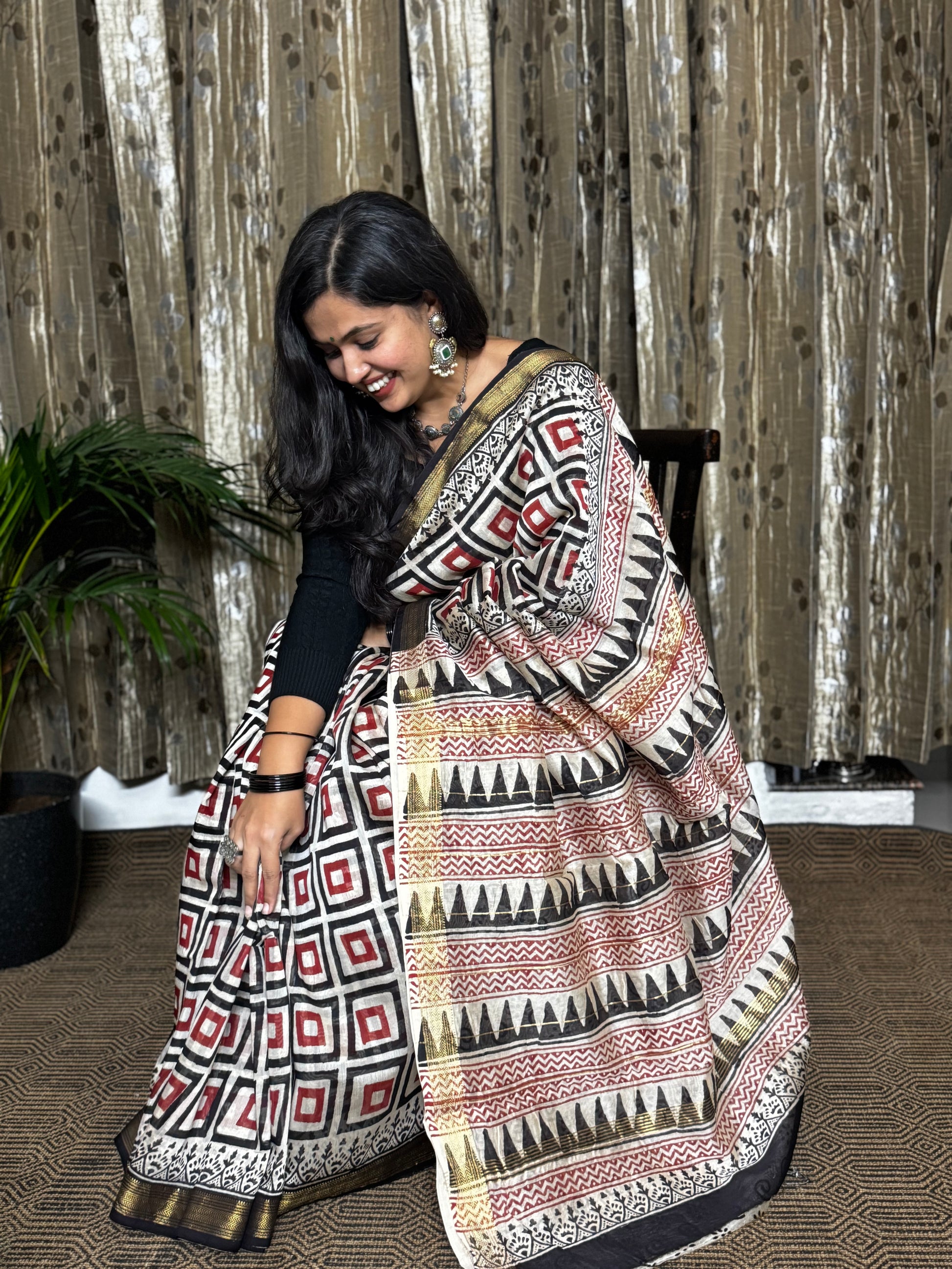 Black and Red Checked Maheshwari Blockprint Saree with Zari Woven Border and complimenting designs on the Pallu. Comes with its own blouse piece.