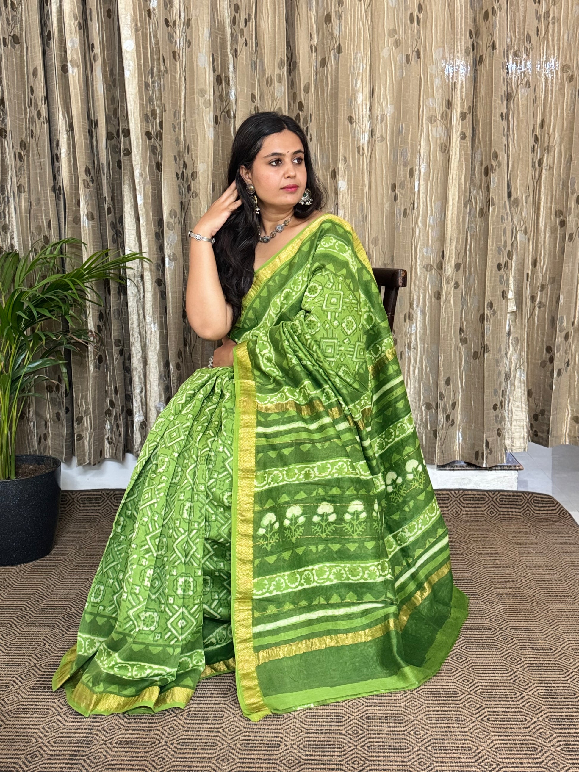 Bright Green Maheshwari Handblock print Saree with Zari Woven Border and complimenting designs on the Pallu. Comes with its own blouse piece.