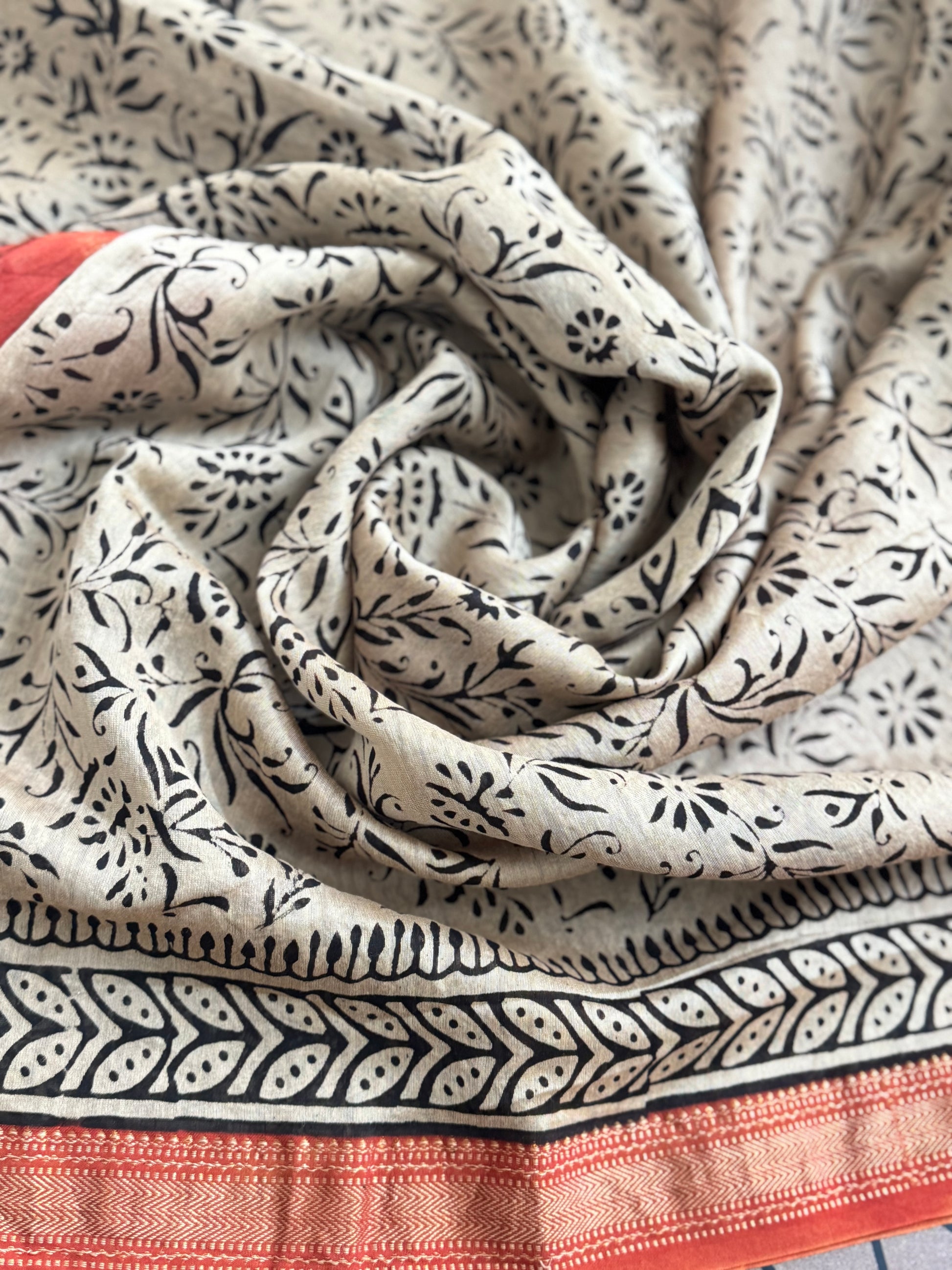 Black Maheshwari Blockprint Saree with Zari Woven Border and complimenting designs on the Pallu. Comes with its own blouse piece.