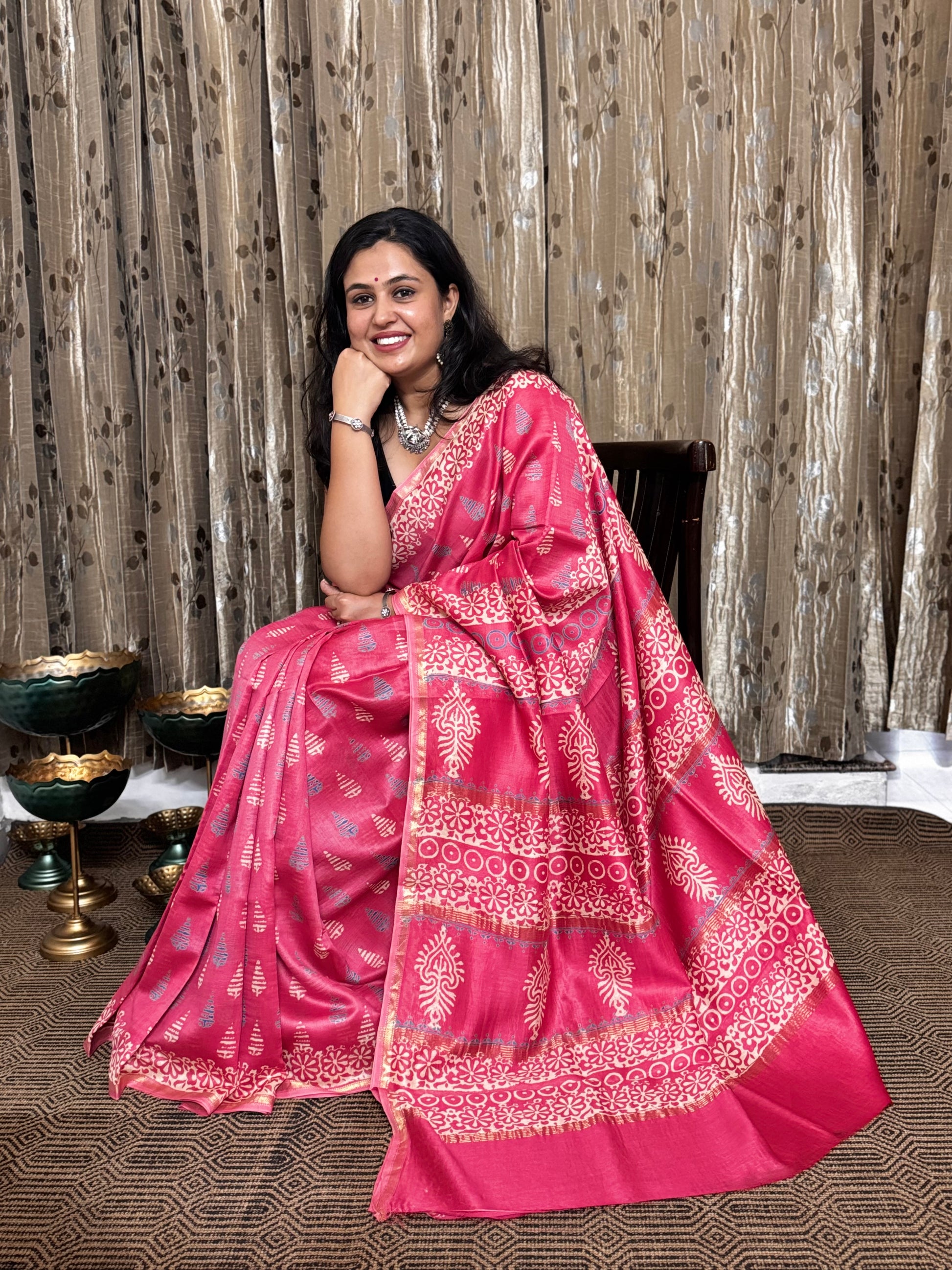 Crimson Maheshwari Blockprint Silk & Cotton Saree with Zari Woven Border and Pallu detailing. Comes with its own blouse piece.