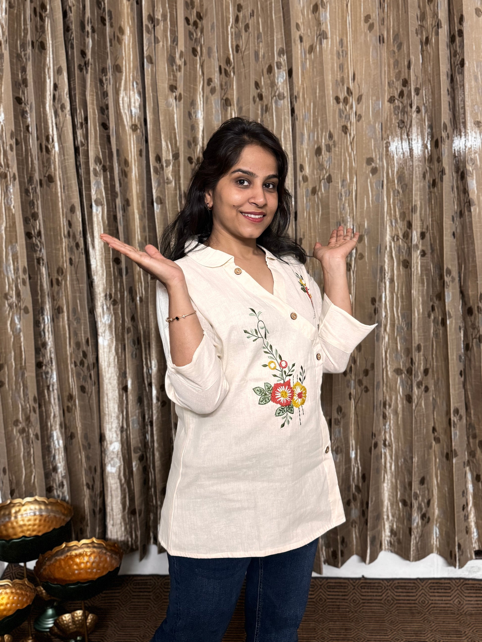 Please ensure first wash dry cleaning only for these Khadi cotton tops. It is advisable to select a size larger than your normal fit, as the fabric may shrink post-wash. Avoid soaking the garment for over five minutes. When hand washing, use only mild detergents to preserve the fabric and delicate hand embroidery.