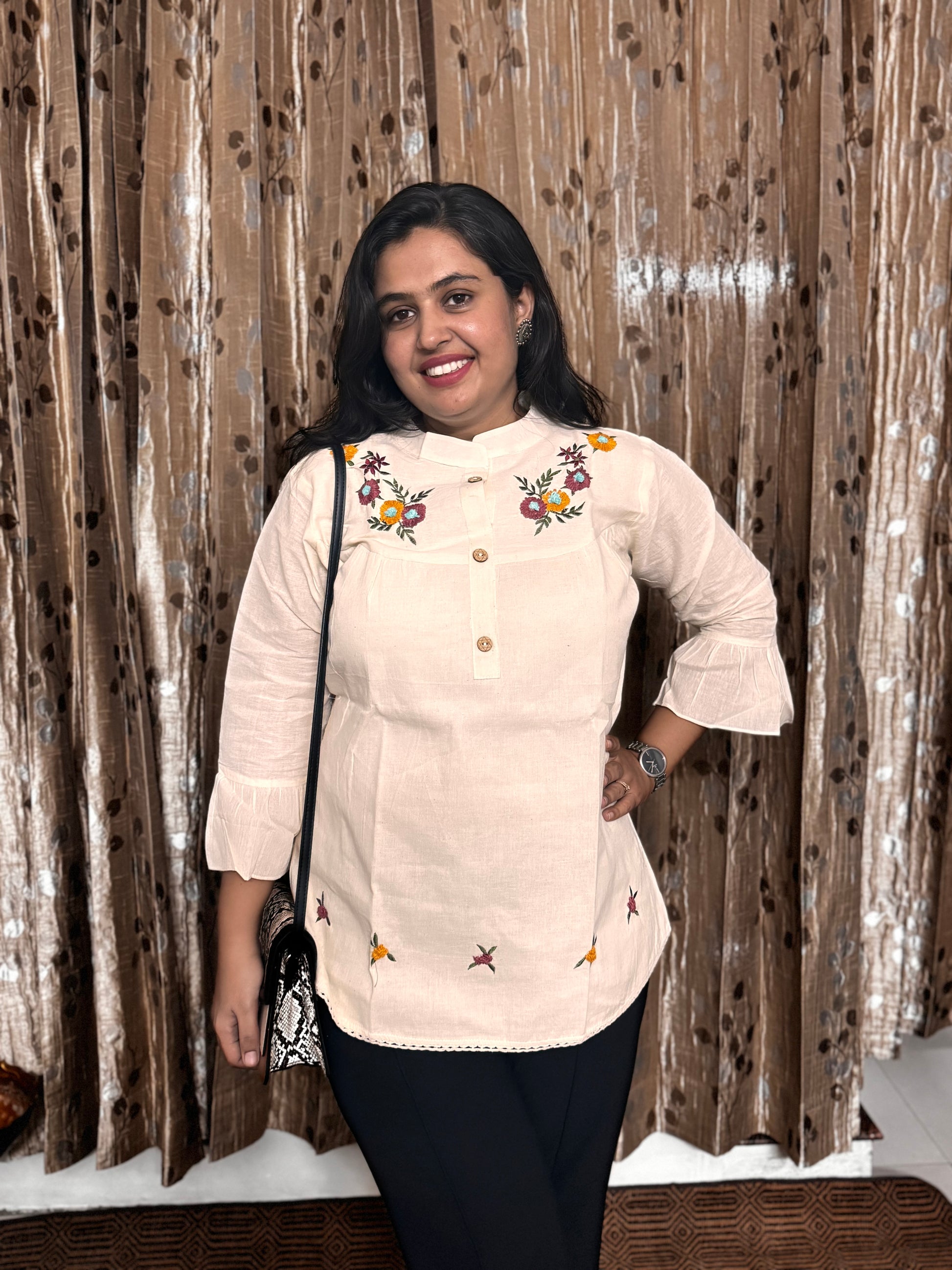Please ensure first wash dry cleaning only for these Khadi cotton tops. It is advisable to select a size larger than your normal fit, as the fabric may shrink post-wash. Avoid soaking the garment for over five minutes. When hand washing, use only mild detergents to preserve the fabric and delicate hand embroidery.