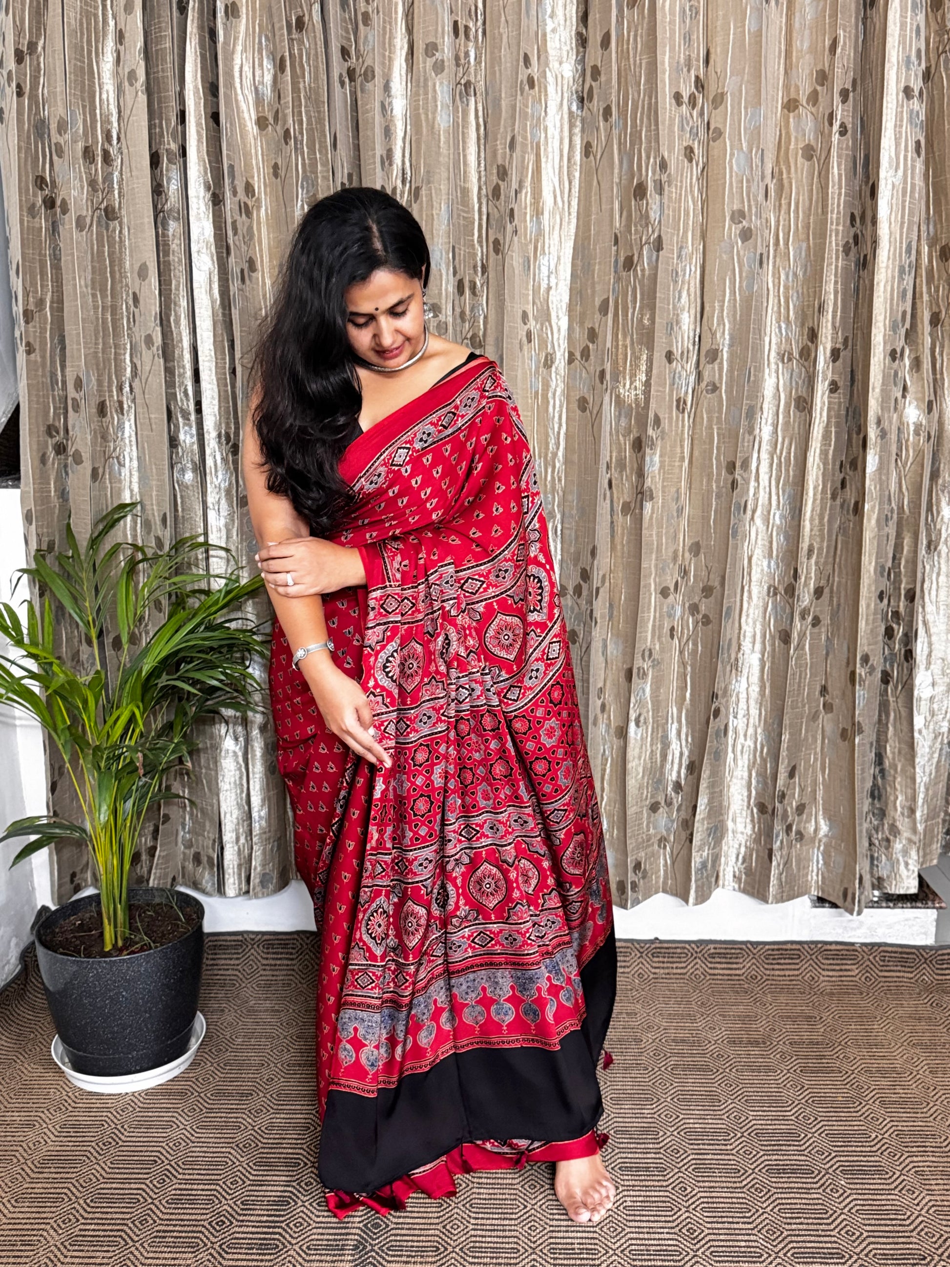 Red Hand Blockprint Ajrakh Modal Silk Saree