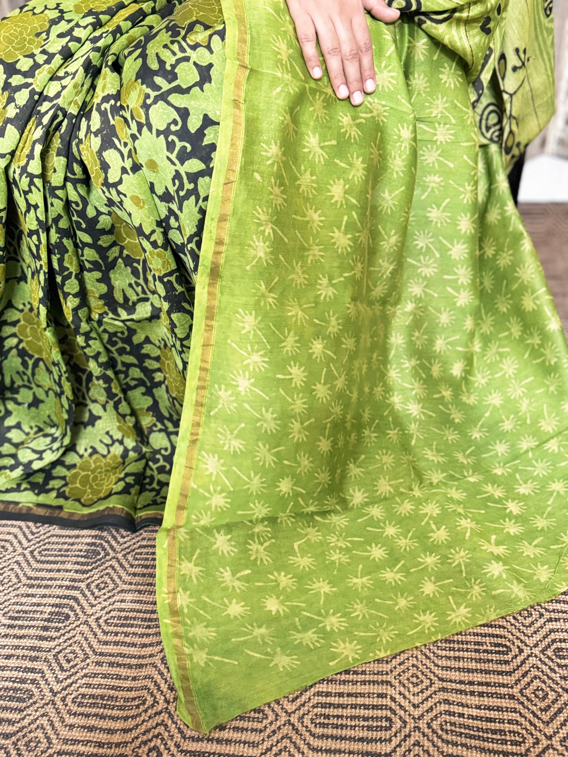 Experience the timeless grace of this Green Chanderi Silk Cotton Saree, where soft, flowy fabric meets geometric and floral patterns. Its elegant drape and smart design make it a versatile choice for any occasion, effortlessly blending tradition with contemporary charm. Let this saree wrap you in subtle sophistication and poetic beauty.