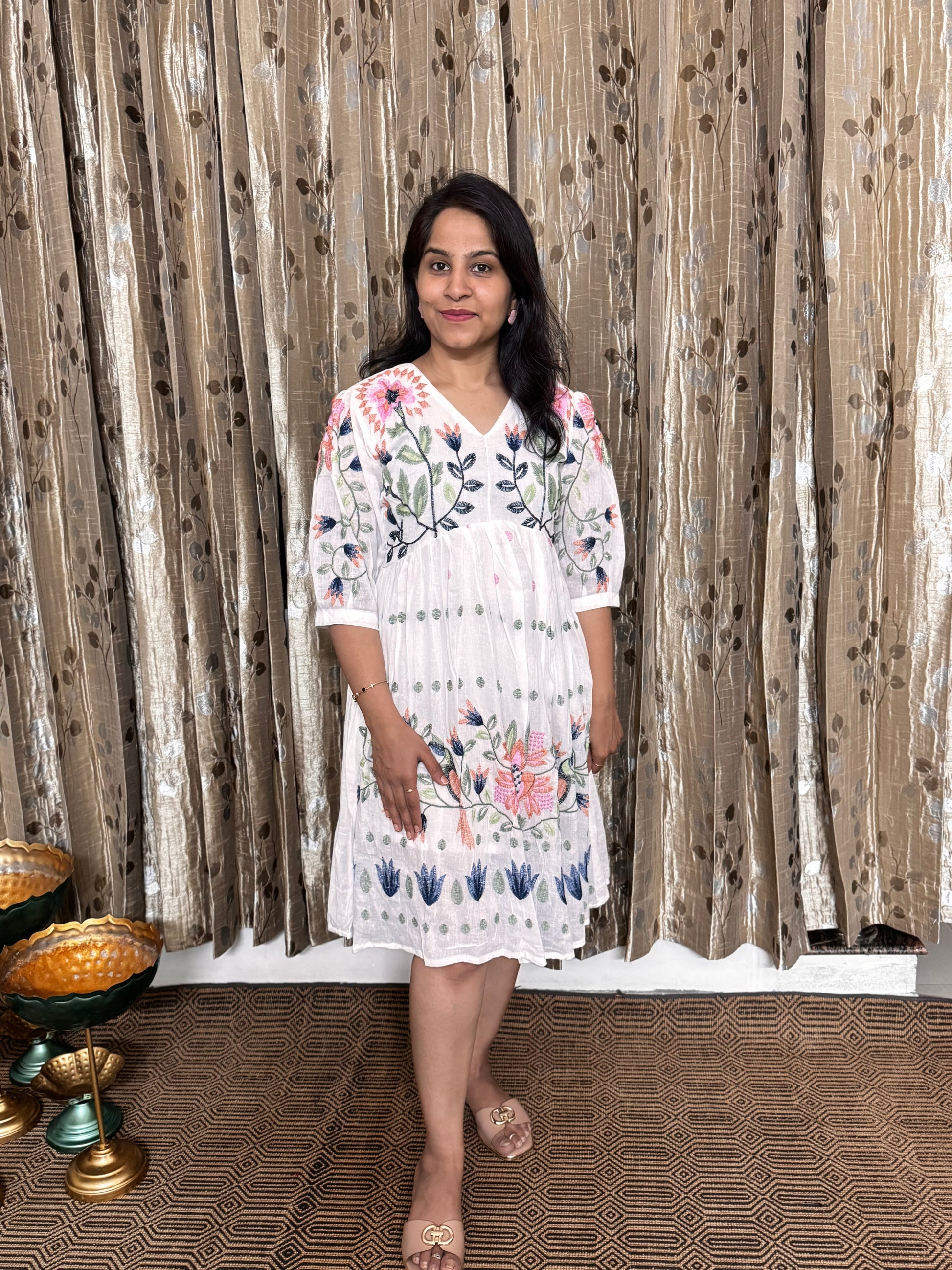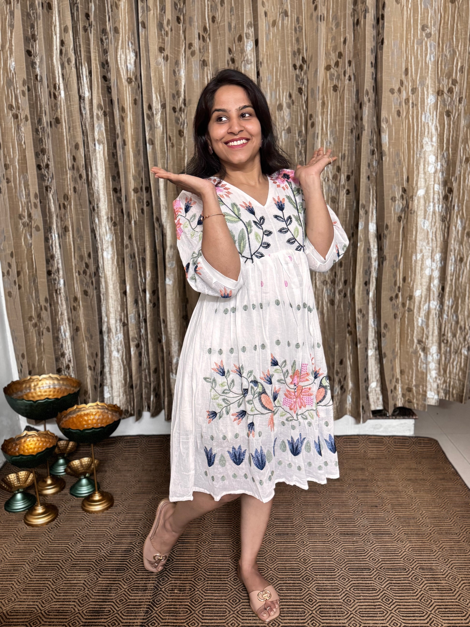 This off-white khadi cotton frock is a charming blend of comfort and style, featuring intricate black embroidery that adds a touch of elegance. The delicate cutwork border enhances its playful appeal, making it perfect for casual outings or festive occasions. Lightweight and breathable, this frock keeps you cool while turning heads with its unique handcrafted details. Embrace effortless grace and a dash of whimsy with this delightful piece that celebrates traditional craftsmanship in a fun, modern way.