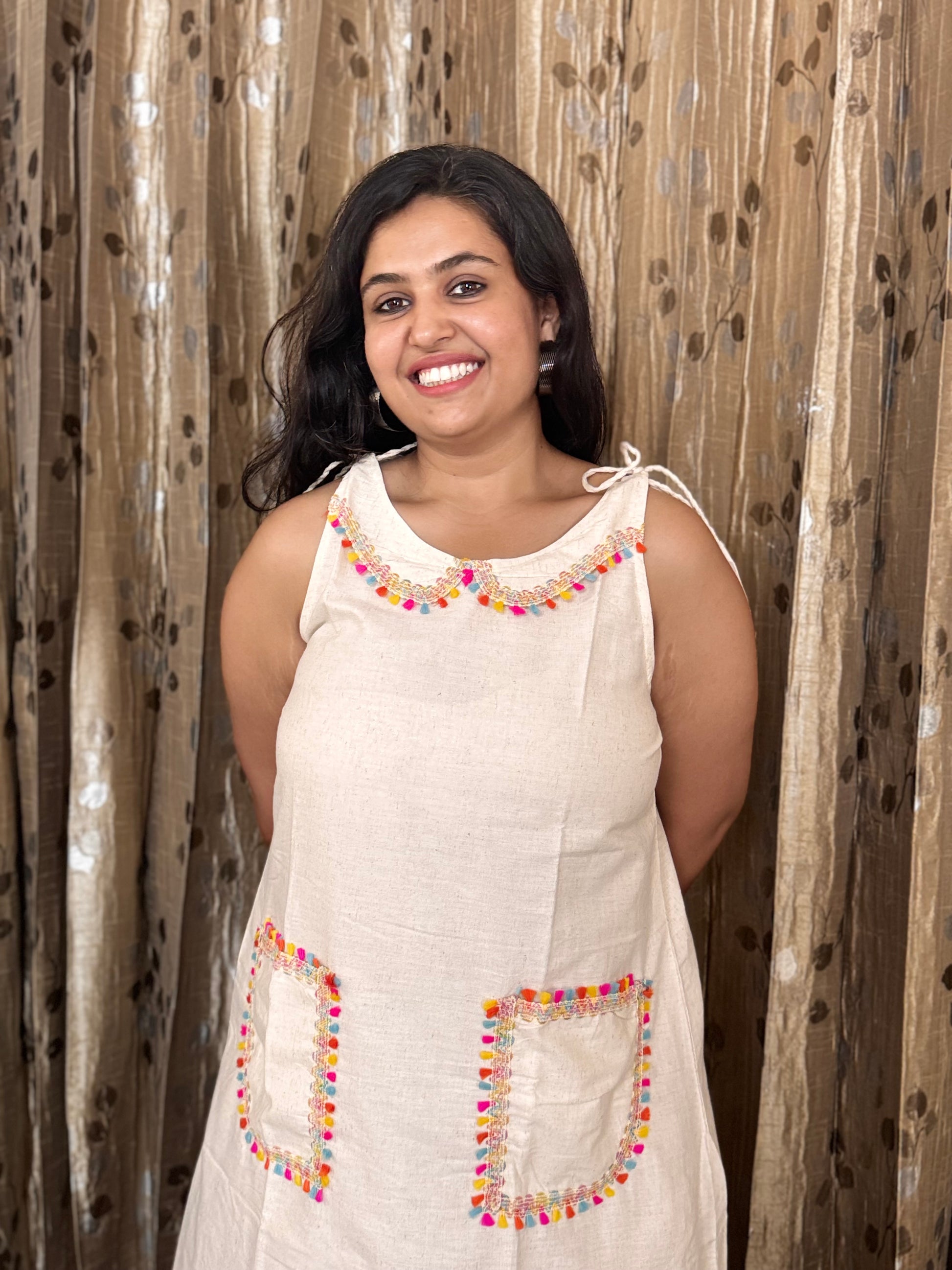 Off white Khadi Cotton frock with Multicolor embroidery.