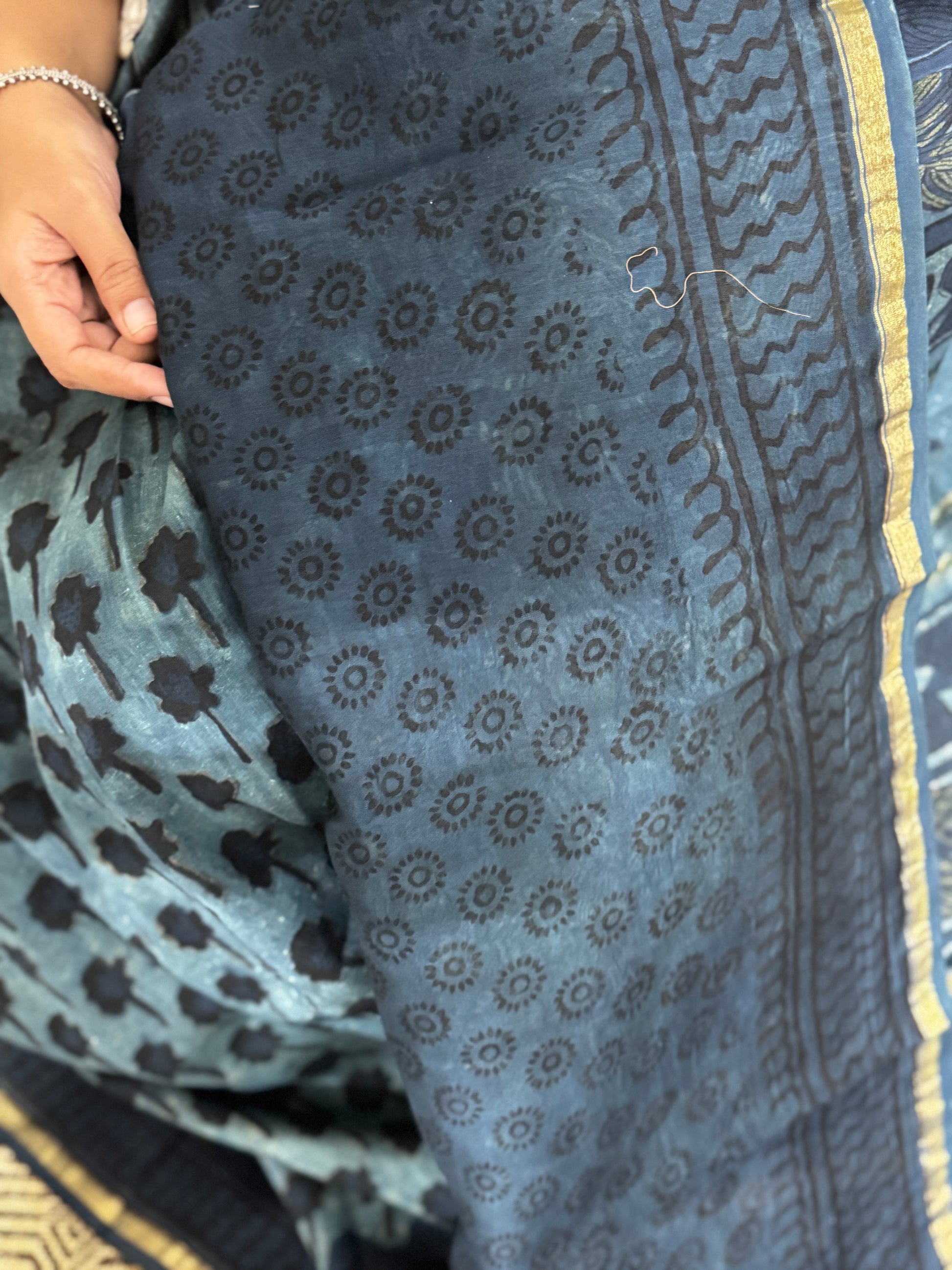 Imdigo Ajrakh Chanderi Blockprint Silk & Cotton Saree with Zari Woven Border. Comes with its own blouse piece.