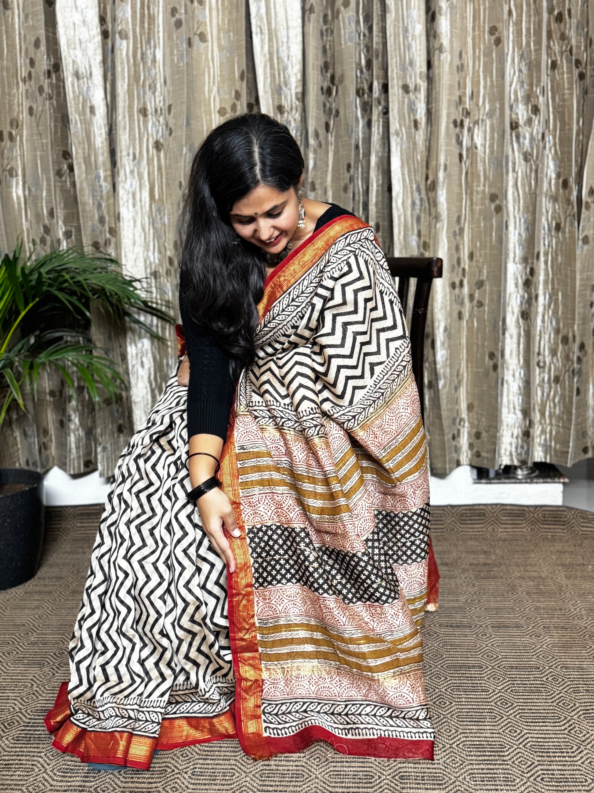 Add a splash of earthy elegance with this Black Chevron Maheshwari Cotton Zari Saree. Featuring subtle handblock prints on soft, lightweight fabric, it’s perfect for effortlessly stylish office days or lively parties. Comfortable yet richly textured, this saree lets you playfully blend tradition with a modern twist.