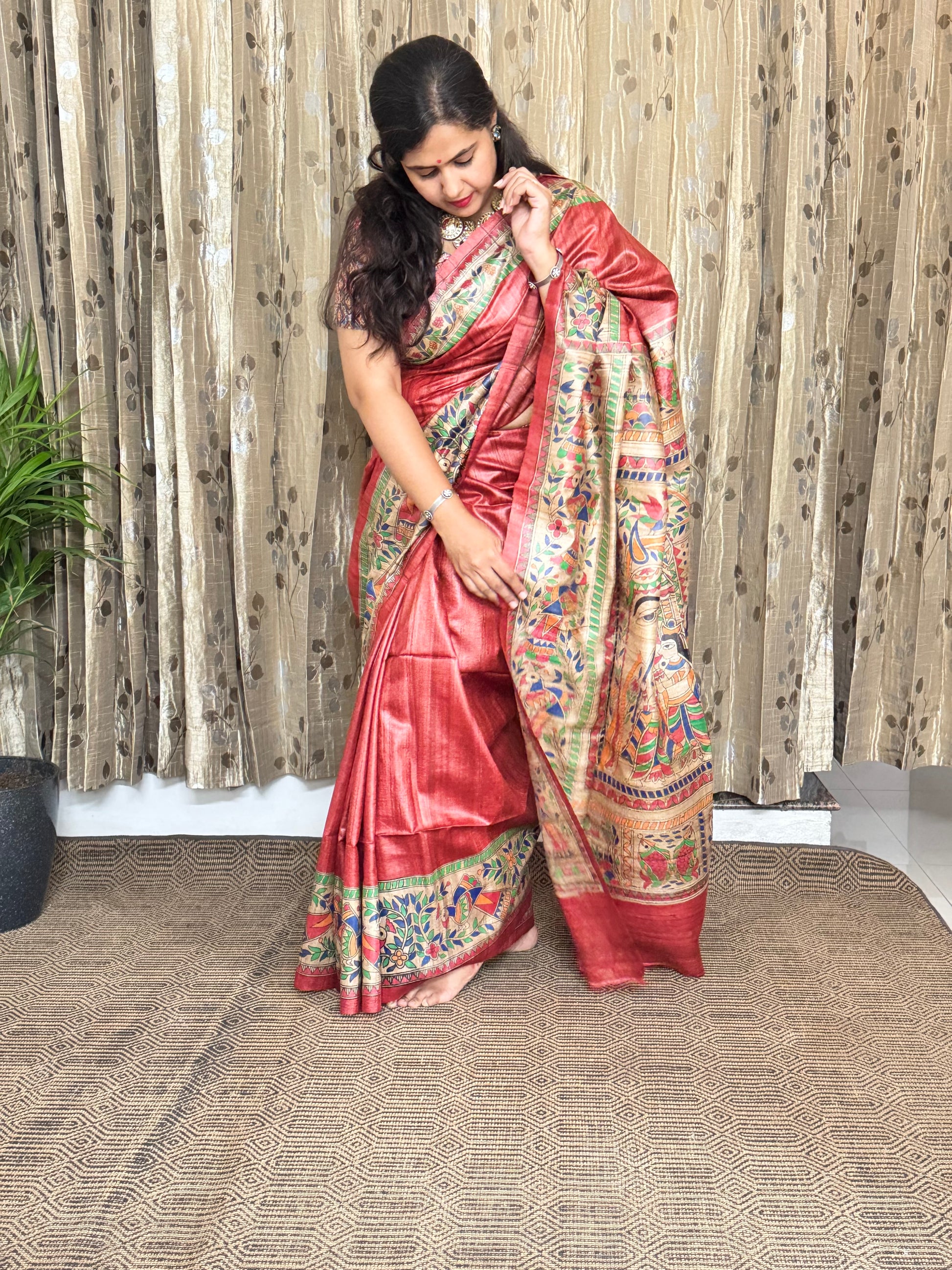 Red Tussar Ghicha Madhubani Silk Saree