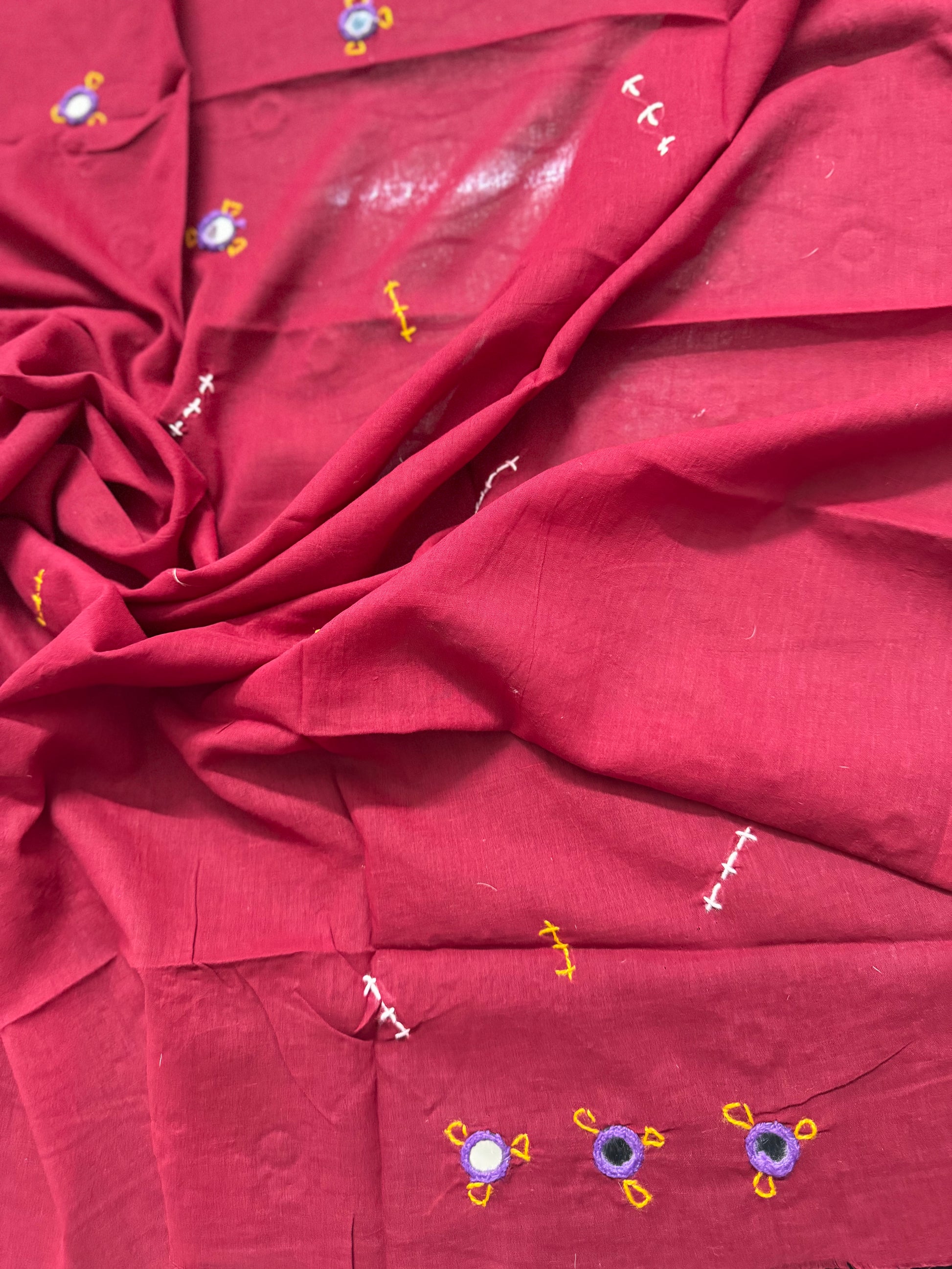 - Blouse Piece: It comes with a RED TAGAI AND MIRROR WORK Cotton blouse piece (100 cm). The last image gives a detailed look of the blouse piece that comes with this saree.