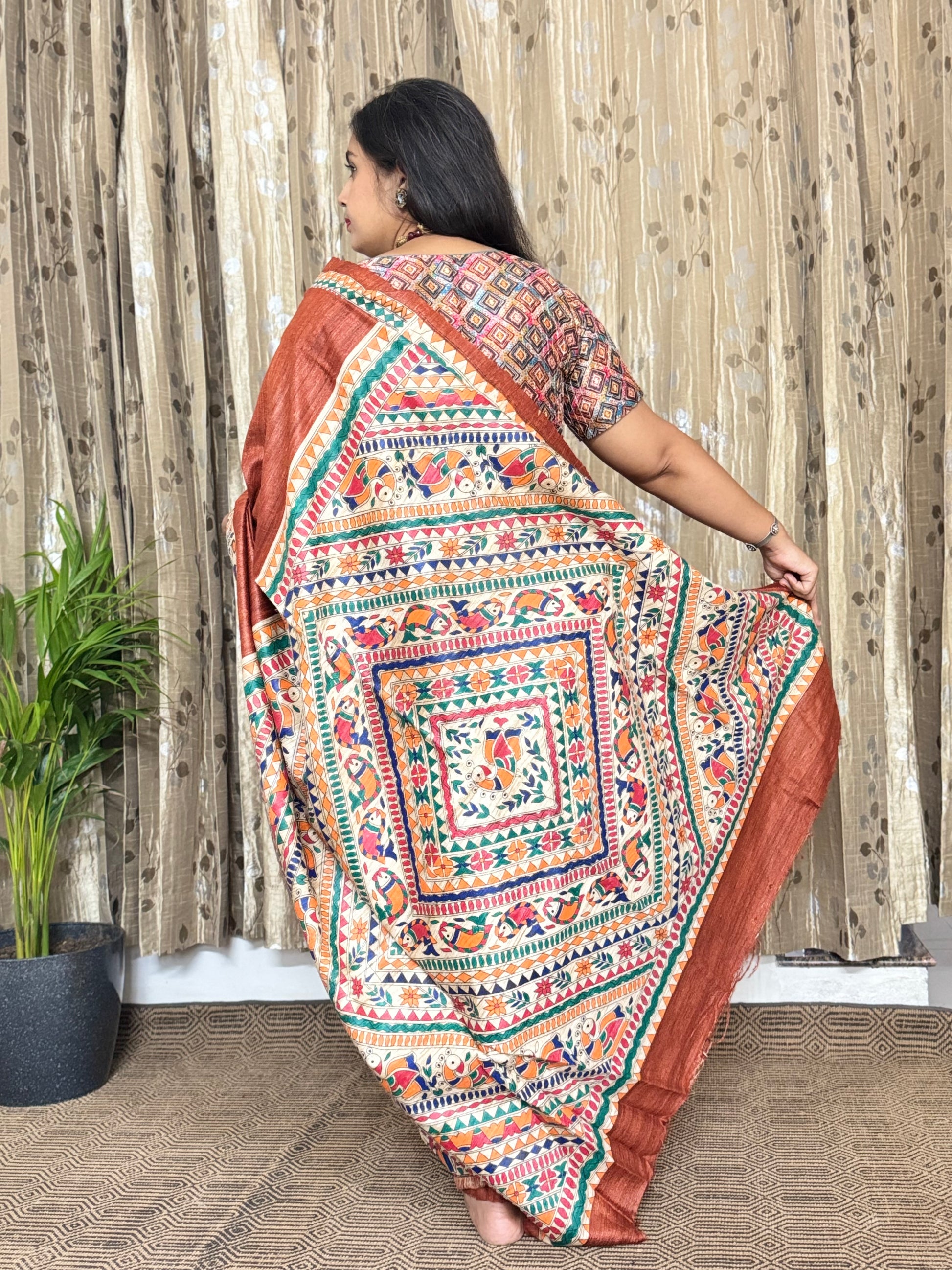 Woven in the natural texture of Tussar Ghicha silk, this saree carries a soft, rustic elegance that feels both timeless and unique. Adorned with handpainted Madhubani art, it reflects the charm of traditional Indian storytelling through intricate patterns and vibrant hues. Each stroke by skilled artisans turns the fabric into a living canvas—where culture, creativity, and craftsmanship come together. This saree is more than just attire; it’s a celebration of heritage, making it a graceful choice for festive occasions or a heartfelt gift for someone special.