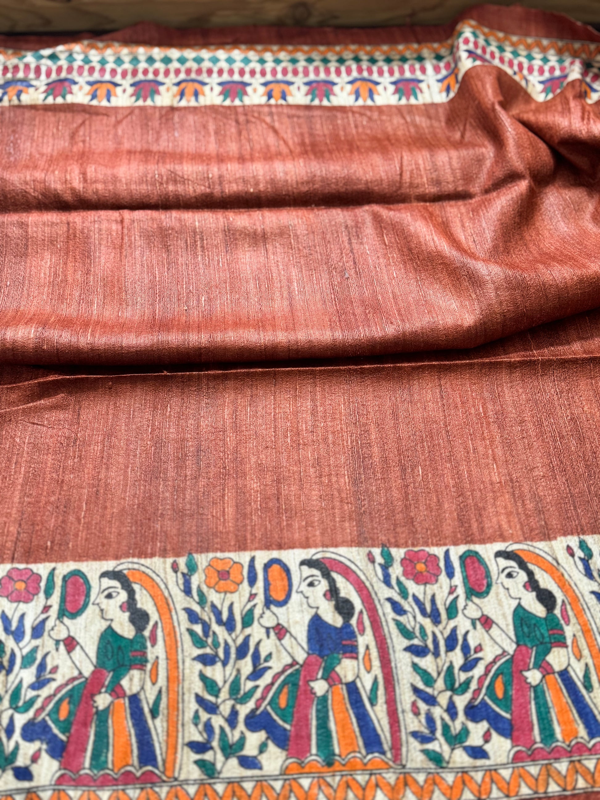 Brown Pure Tussar Ghicha Madhubani Silk Saree